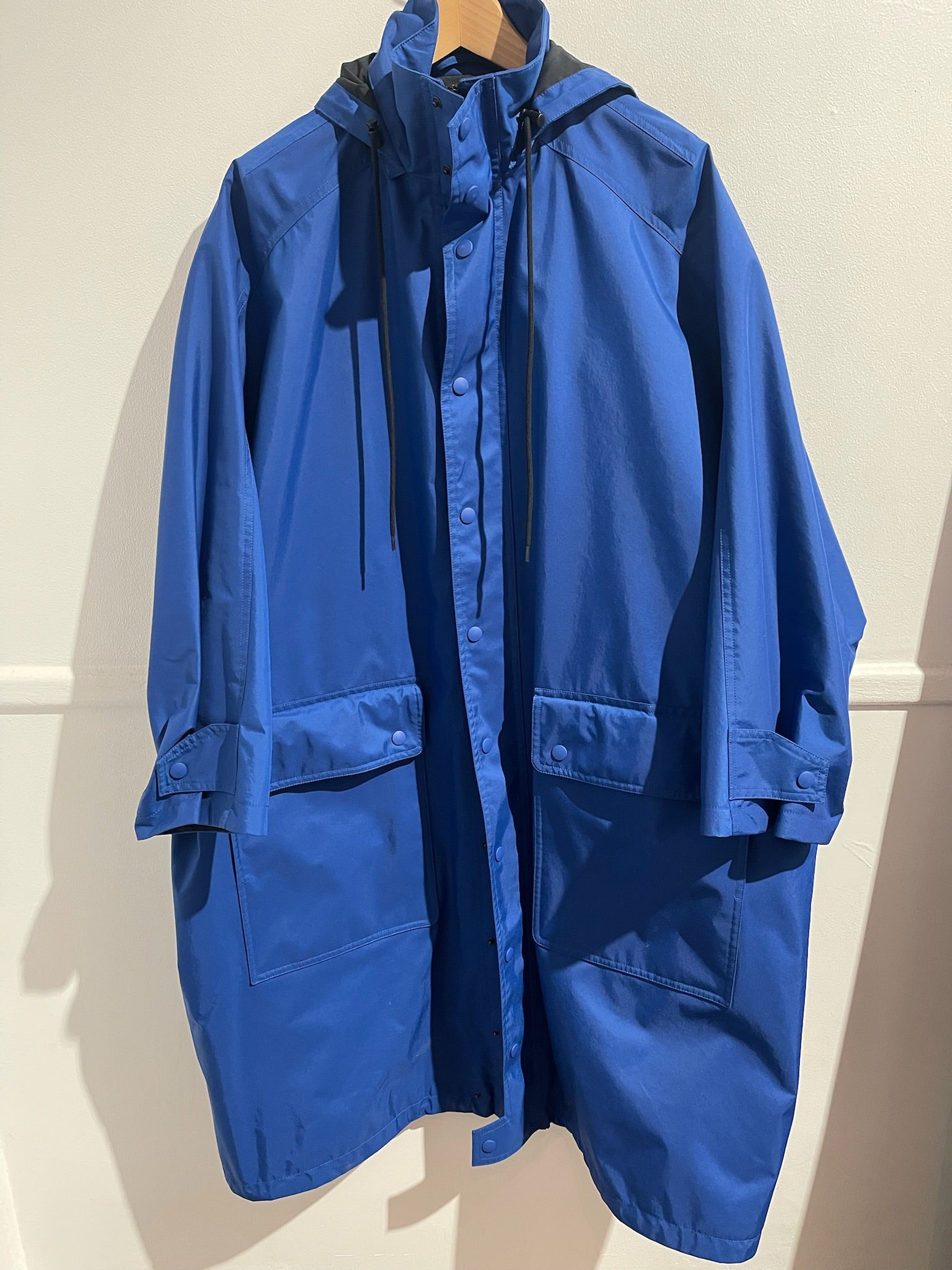 Trench en polyamide bleu cyan avec fermeture zippée et boutonnée. Capuche, logo noir dans le dos. Coupe fluide et oversize. Modèle unisexe.
