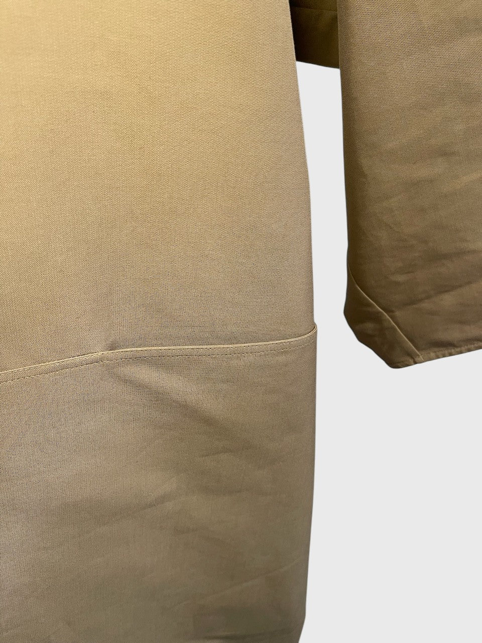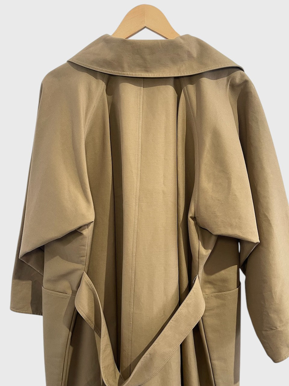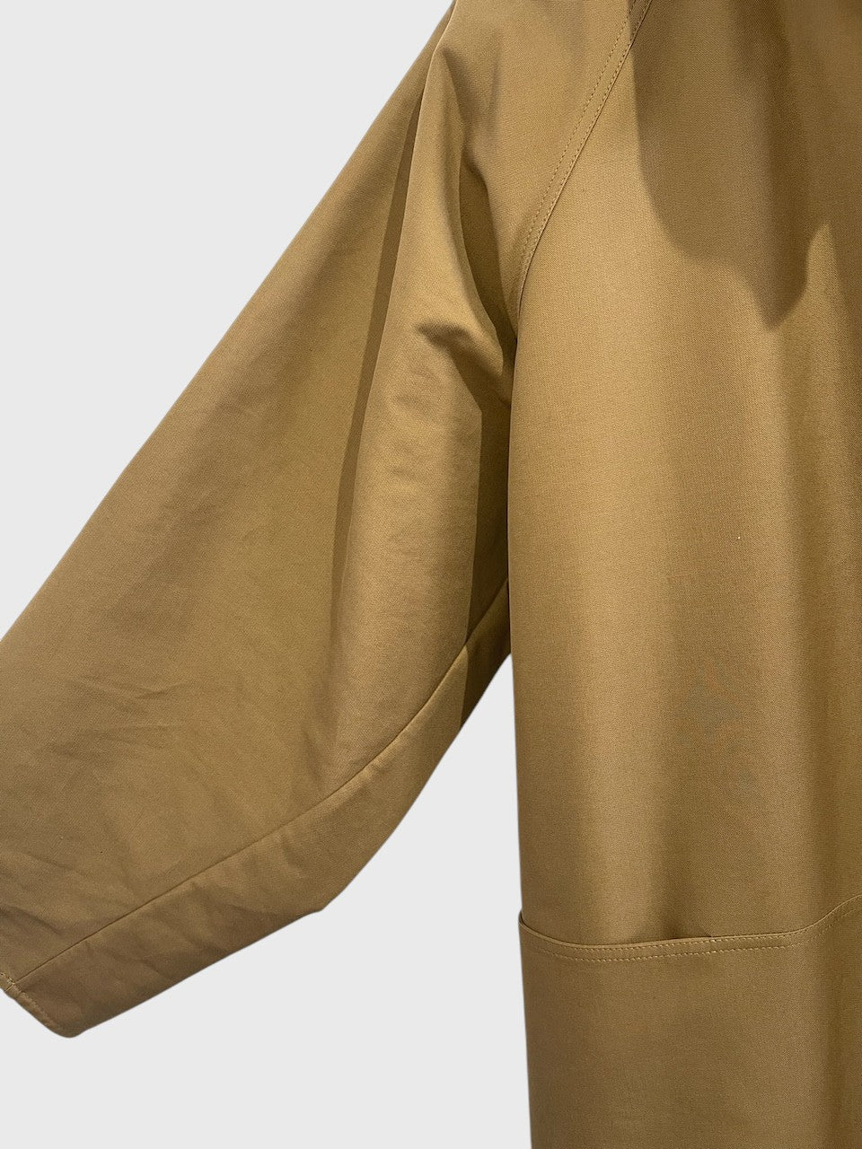 Trench en coton beige foncé avec fermeture et col à bouton et larges manches. Poches latérales. Martingale et fente arrière. Coupe ample.
