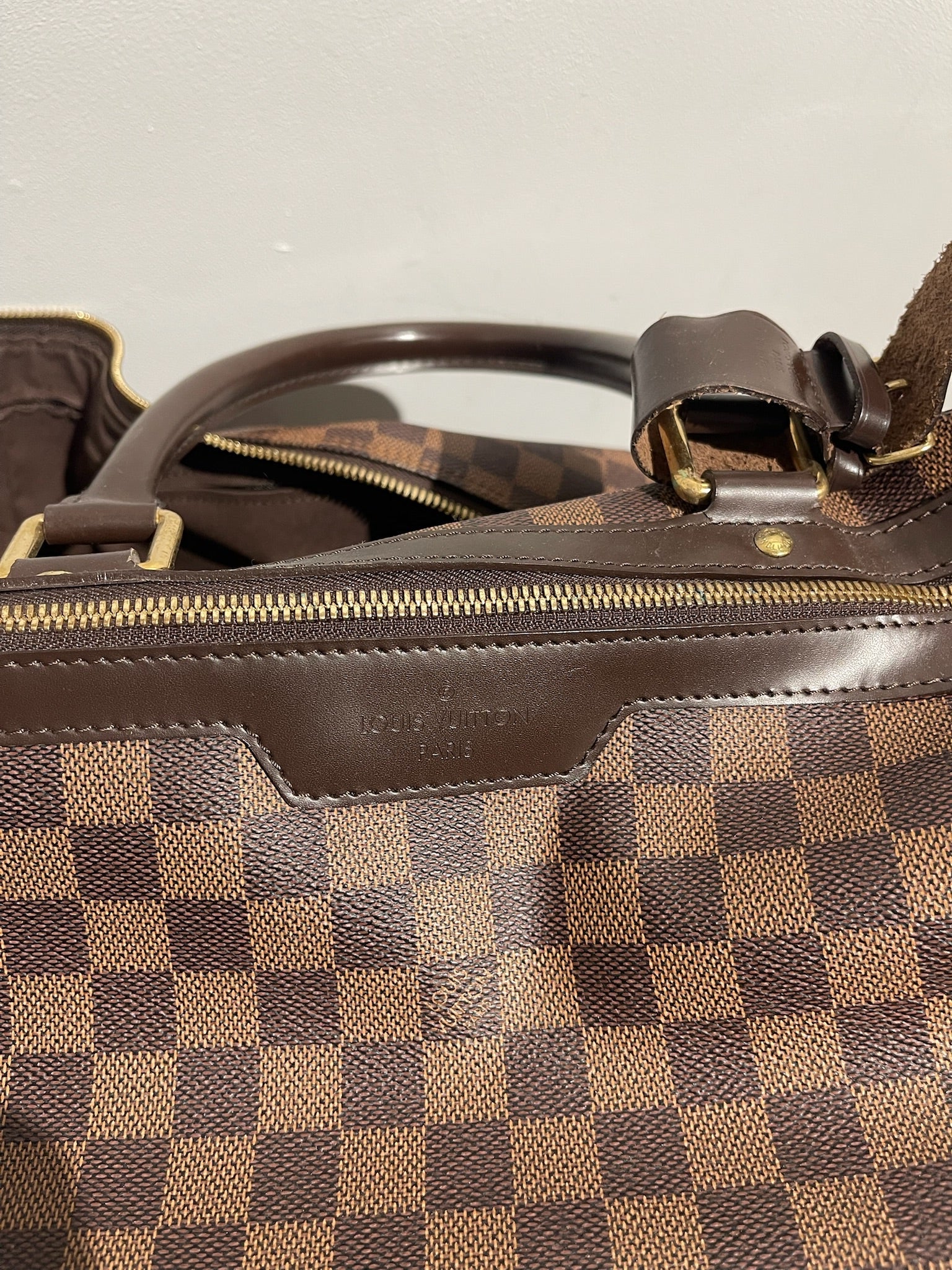 Bagage à roulettes, taille cabine en toile damier ébène monogram LV et finitions en cuir marron. L'avant présente une poche extérieure zipée sur toute la longueur. Anse supérieur au dessus et double fermeture éclair supérieure s'ouvre sur un intérieur spacieux en tissu avec deux poches intérieures. Ce sac peut être porté par les poignées supérieures, la poignée latérale ou la poignée extensible dissimulée sur le haut grâce à une fermeture zipée. Etiquette bagage. Boucle ajustable sur le dessus.