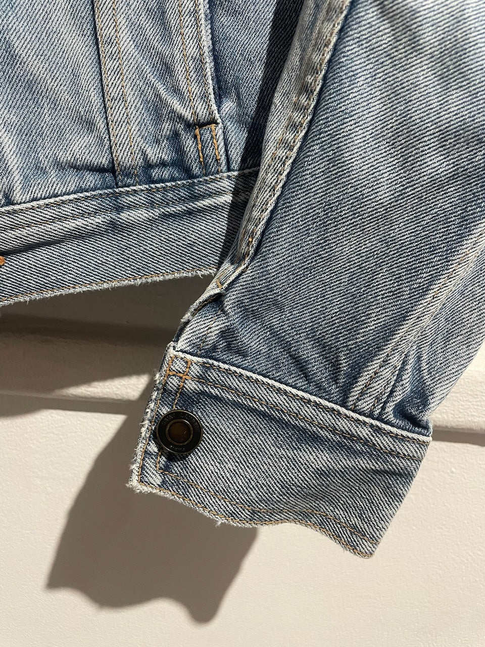 Veste en jeans délavé bleu avec fermeture boutonnée et poches latérales. Boutons signés Saint Laurent. Coupe ajustée.