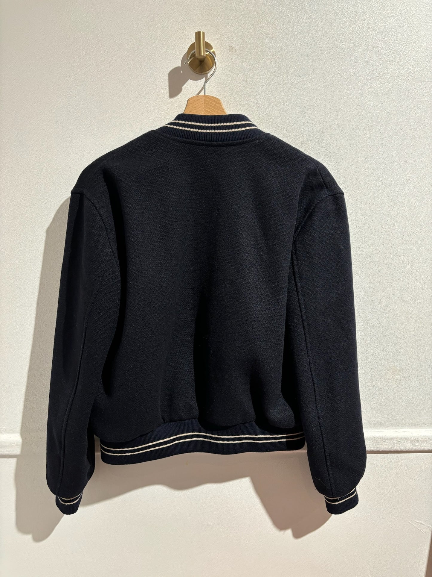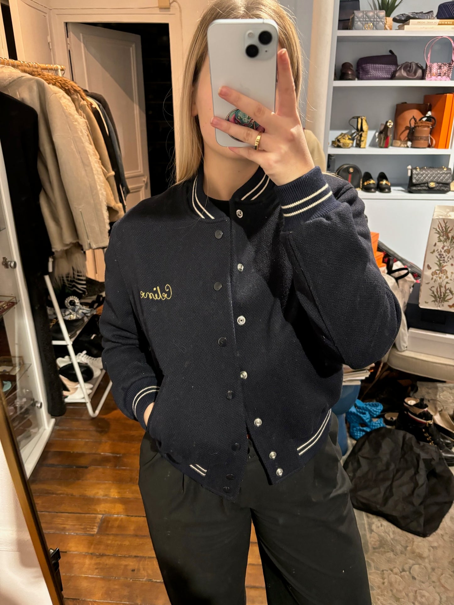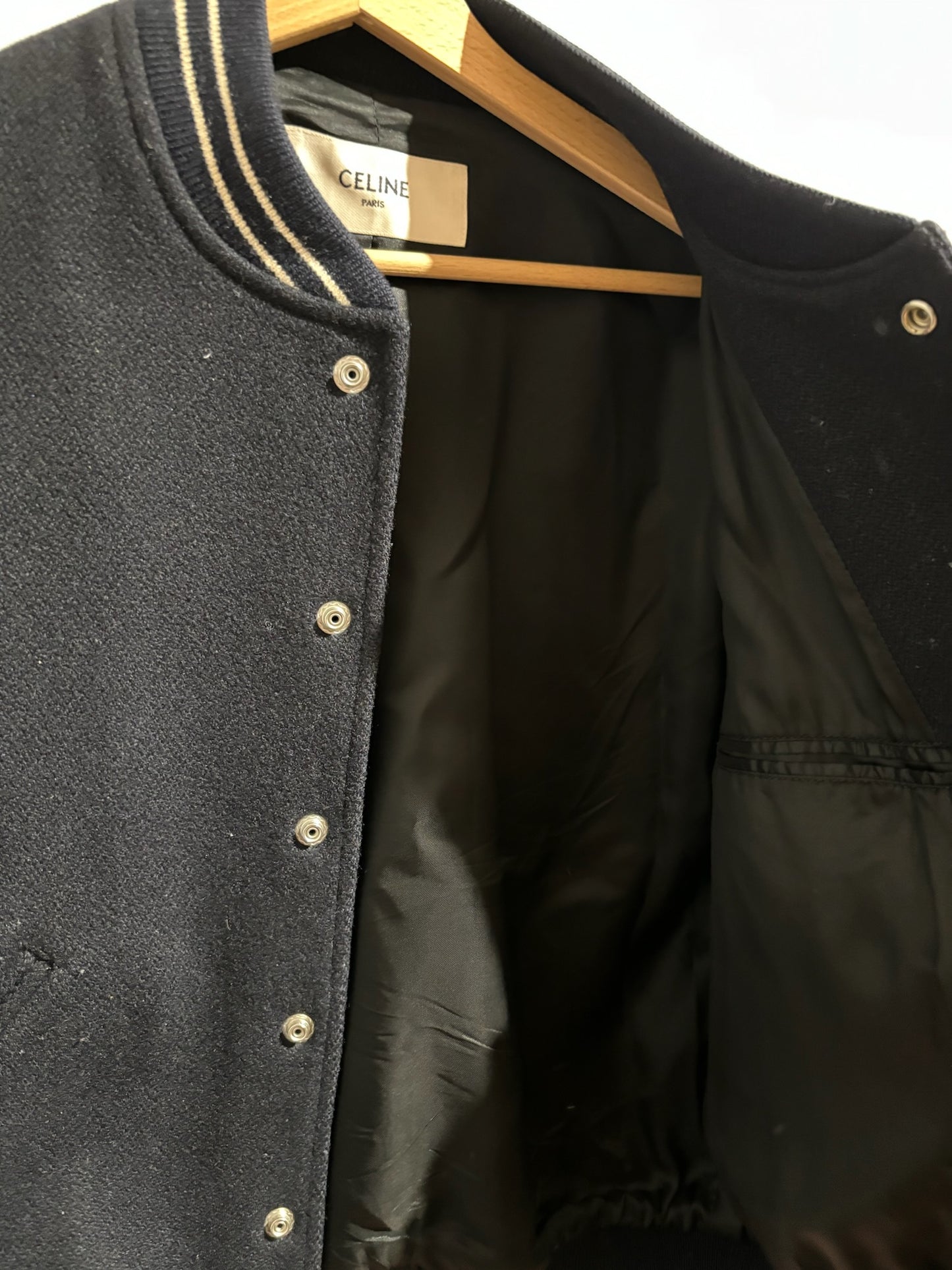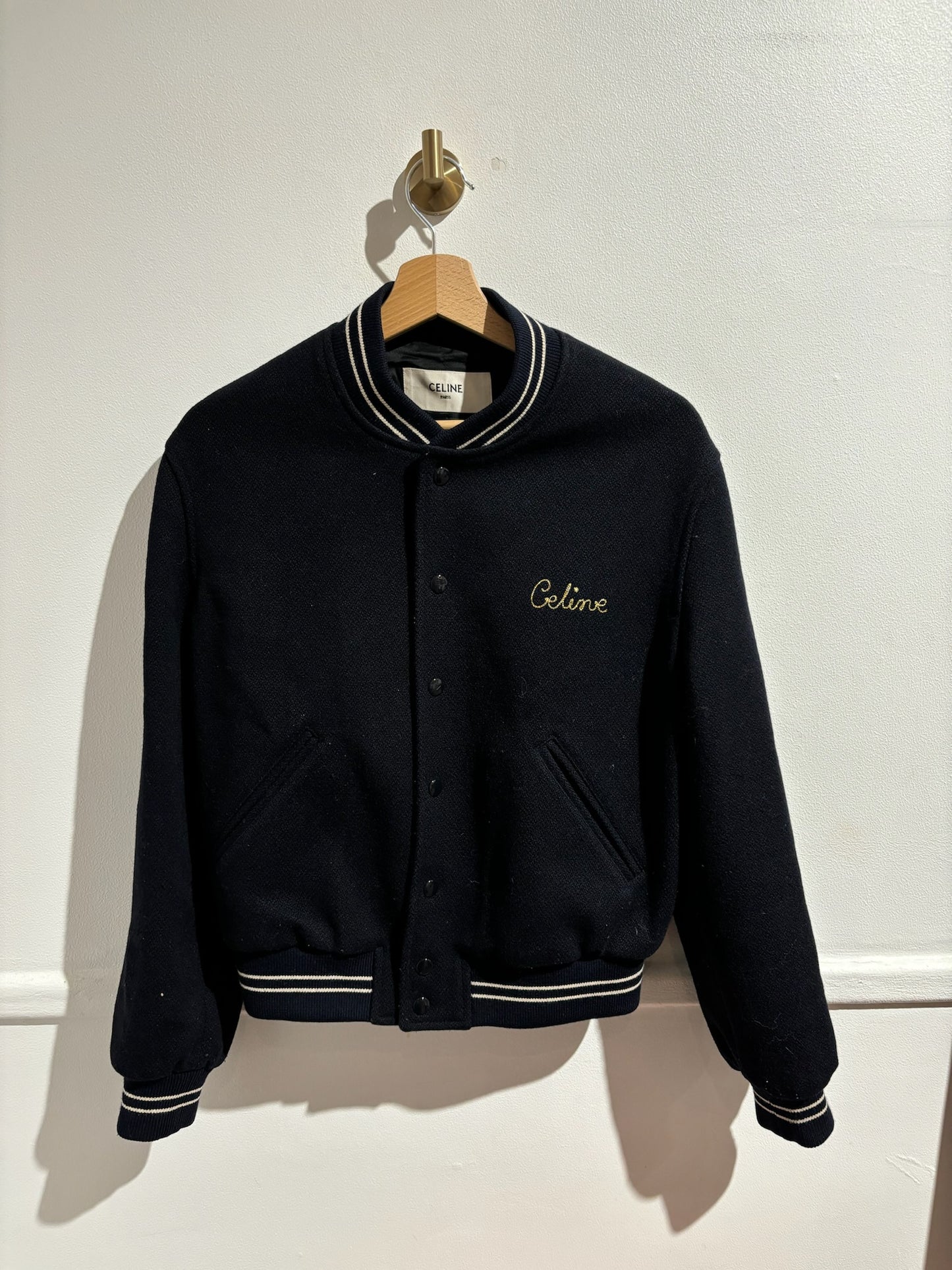 Veste Teddy en laine bleu intense (presque noir). Broderie Celine sur la poitrine. Col teddy bicolore. Fermeture bouton pression. Doublure en soie.