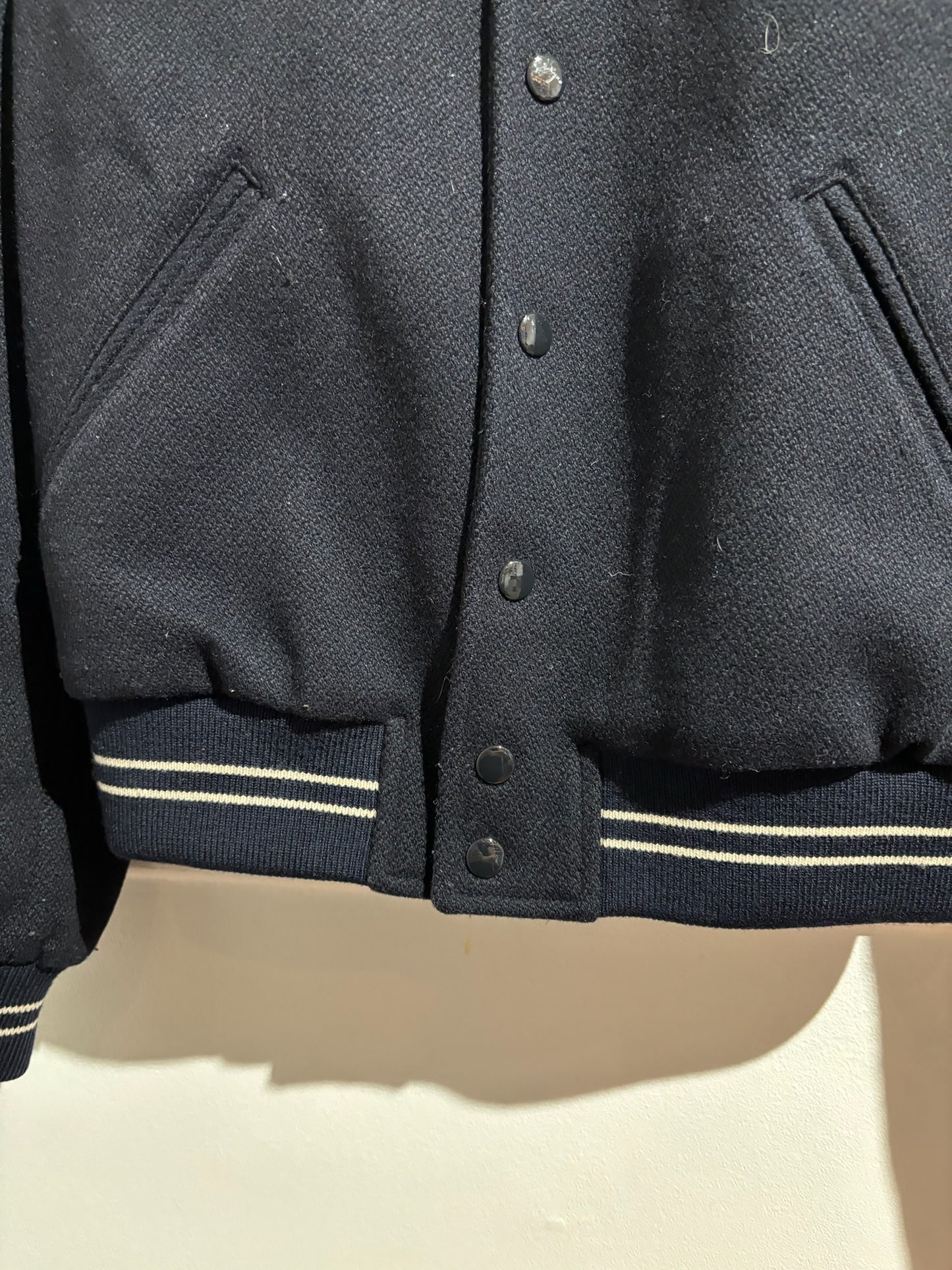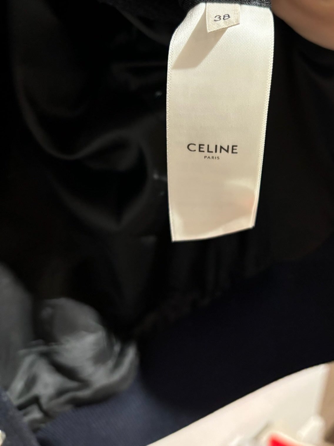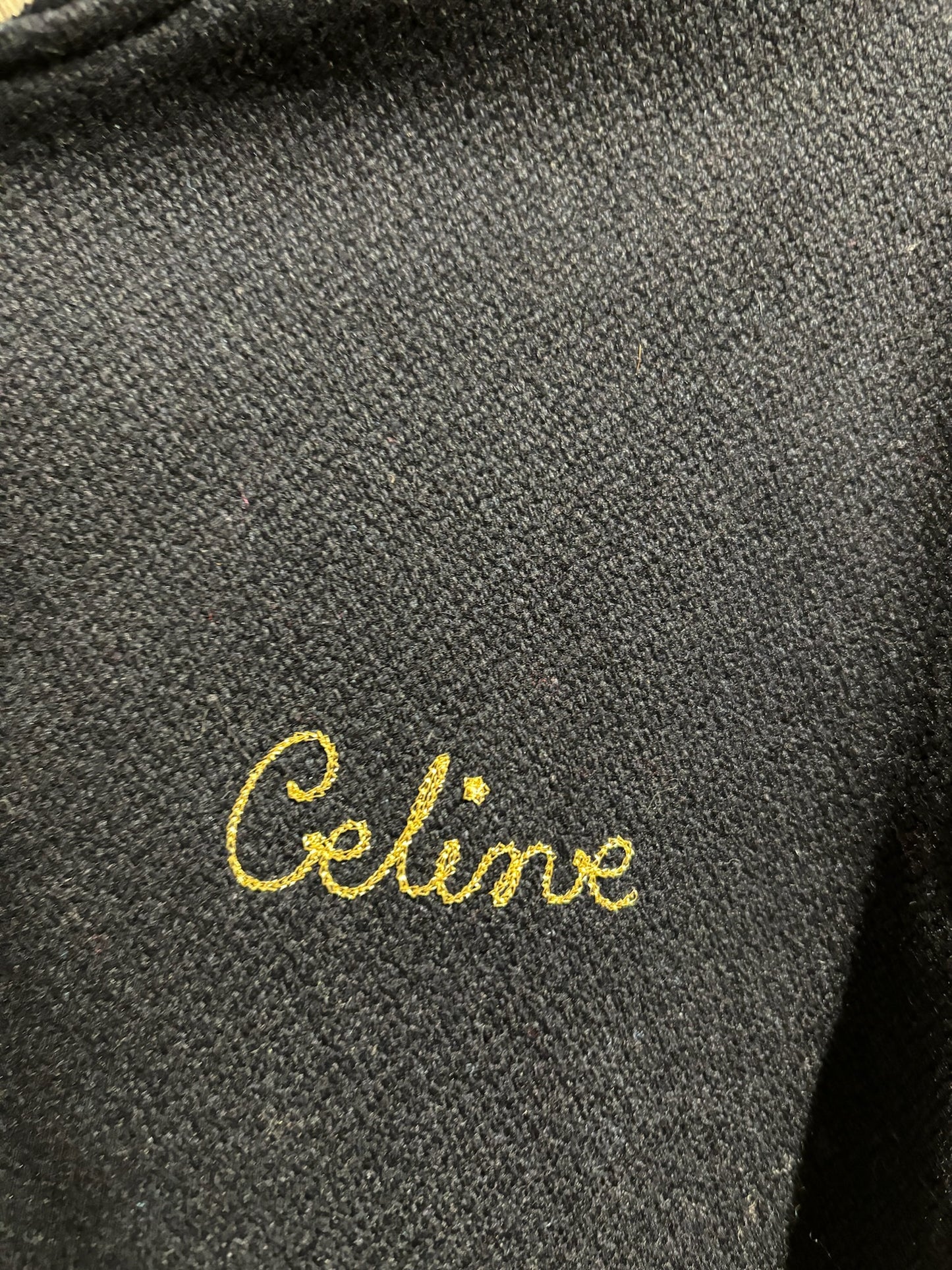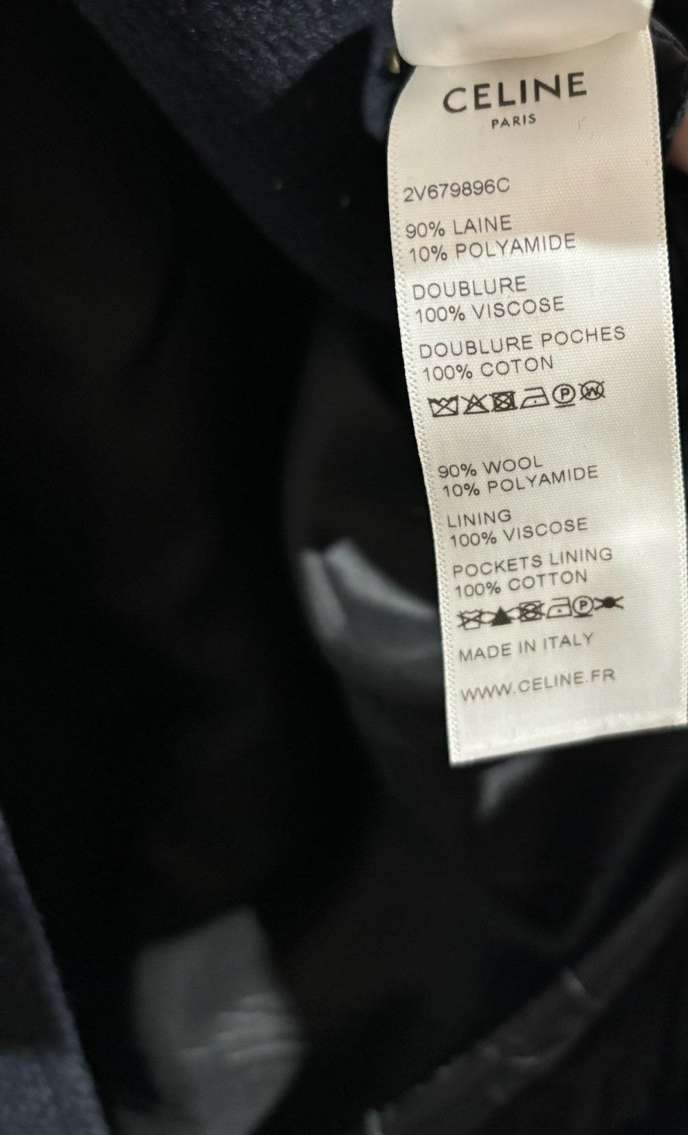 Veste Teddy en laine bleu intense (presque noir). Broderie Celine sur la poitrine. Col teddy bicolore. Fermeture bouton pression. Doublure en soie.