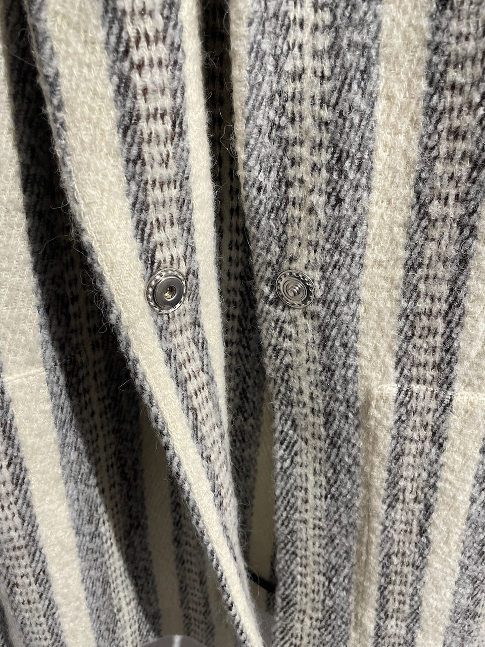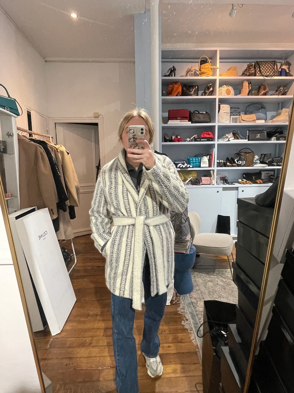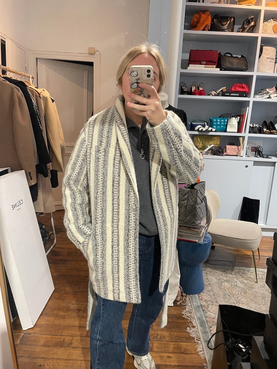 Veste en maille épaisse écru à rayures avec fermeture par bouton-pression et taille ceinturée. Poches latérales.