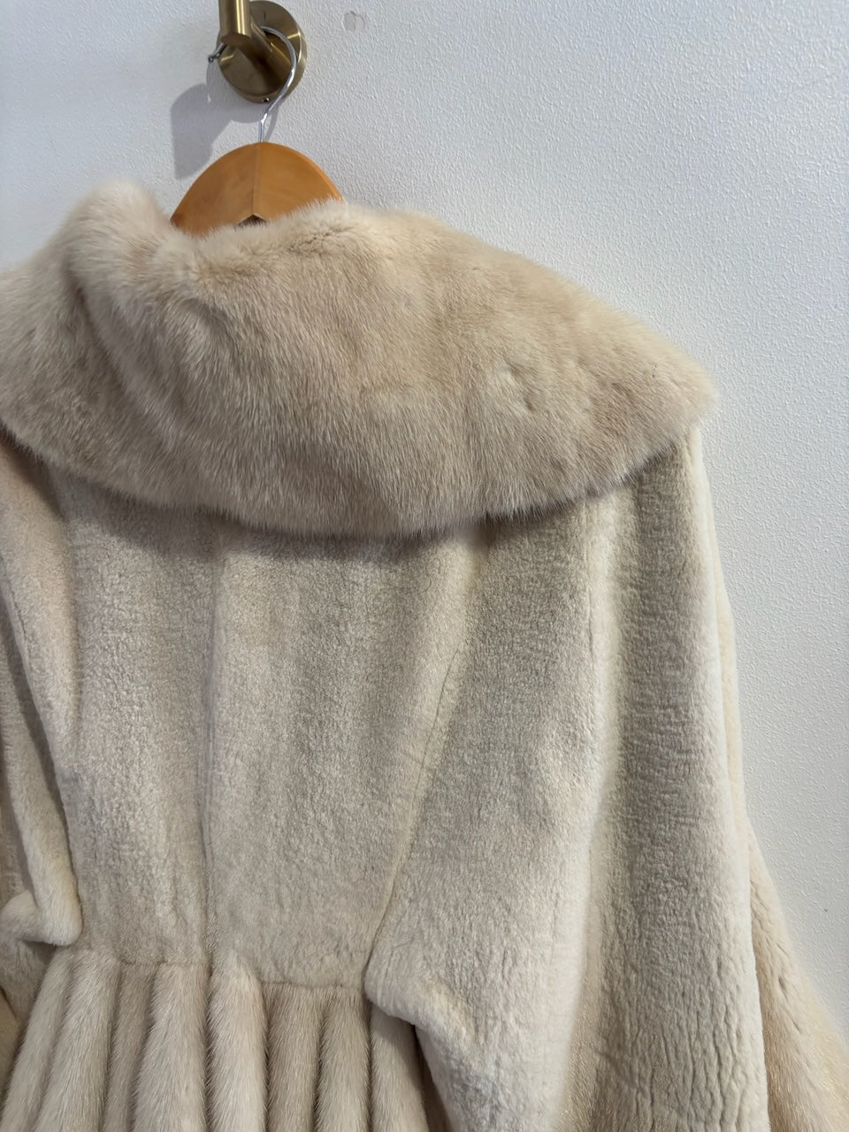 Veste courte en vison beige avec jolie col revers, fermeture par agrafes et manches trois-quarts. Effet plissé sur le bas du dos et lien à nouer depuis l'intérieur.