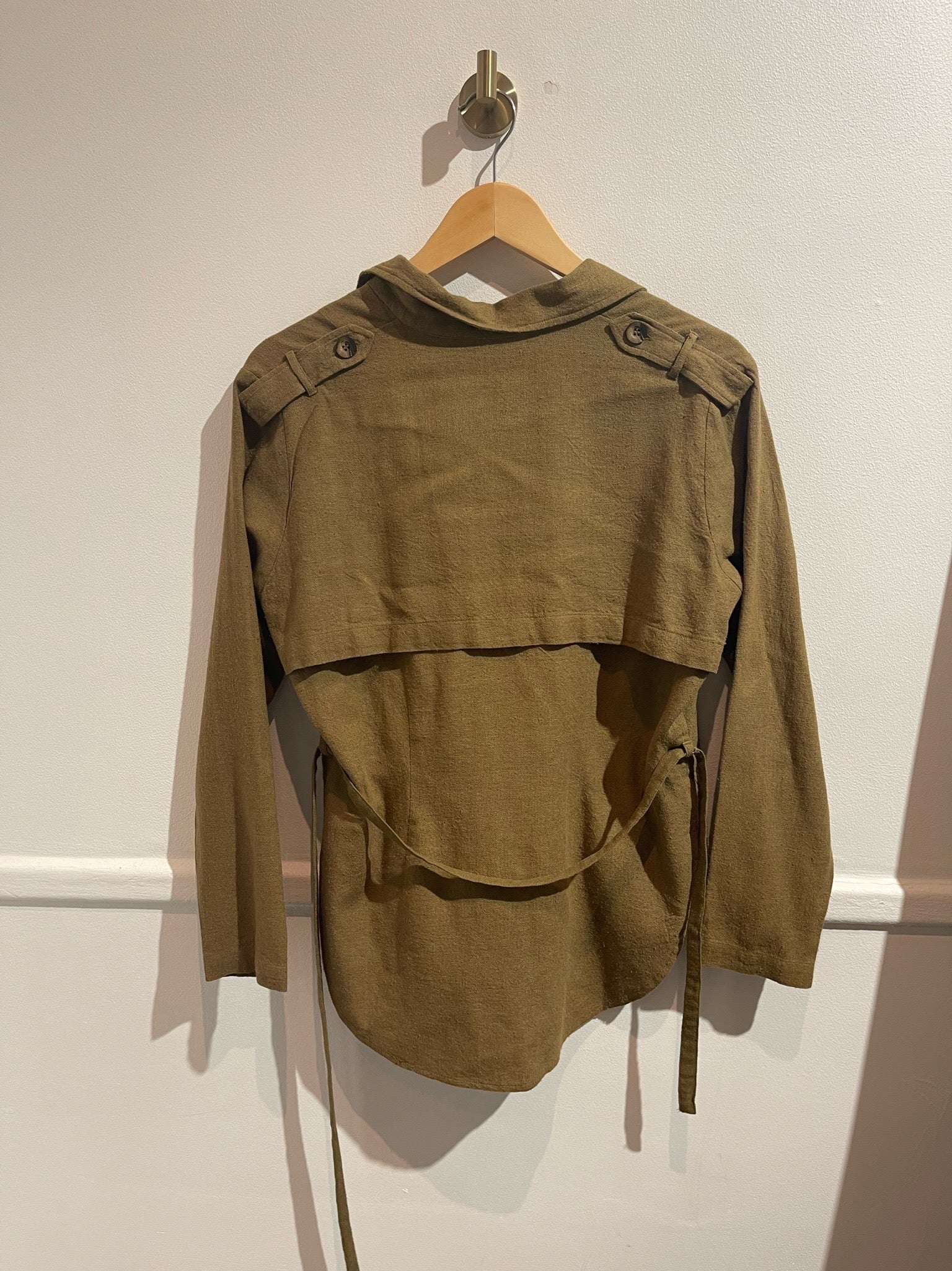 Sur-chemise en soie kaki. Ceinture en soie kaki amovible. Fermeture à boutons. Veste courte.