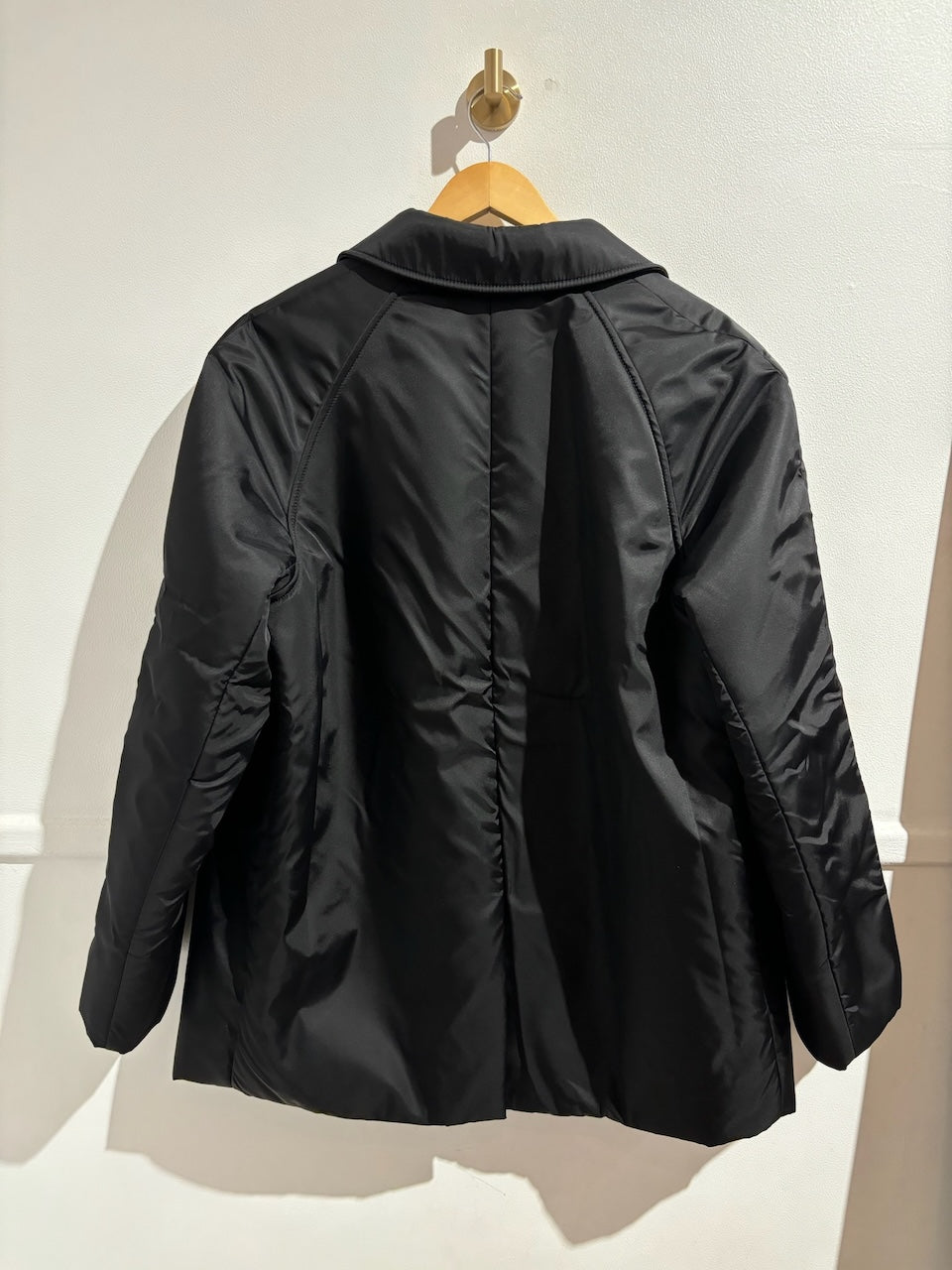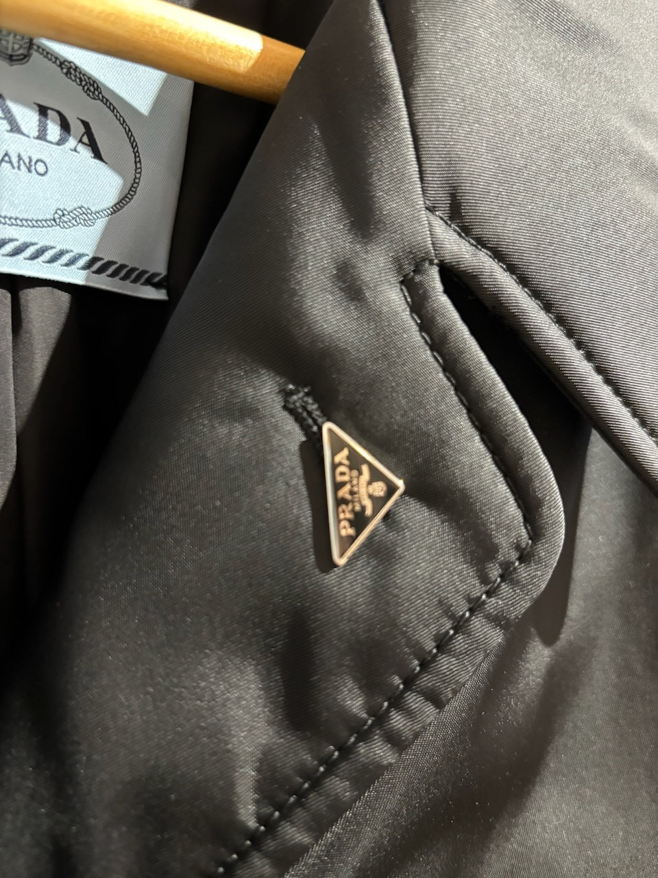 Veste blazer en nylon noir avec logo triangle Prada au col, fermeture boutonnée et poches latérales. Fente arrière. Coupe oversize.