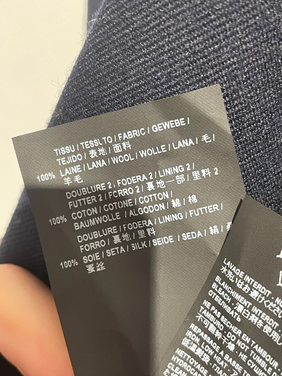 Blazer en laine bleu marine avec fermeture boutonnée, poches latérales et poignets boutonnés. Boutons signés Saint Laurent. Coupe ajustée.