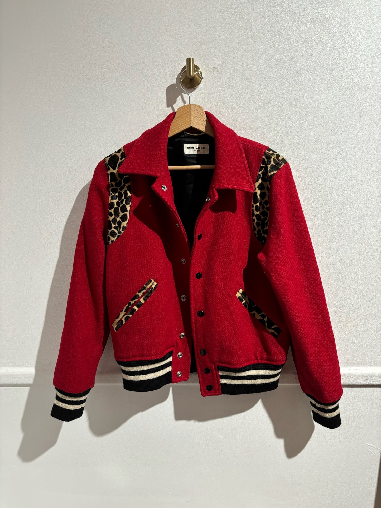 Bomber rouge et détails noir et léopard en laine avec fermeture bouton pression. Doublure en soie. Coupe légèrement oversize.