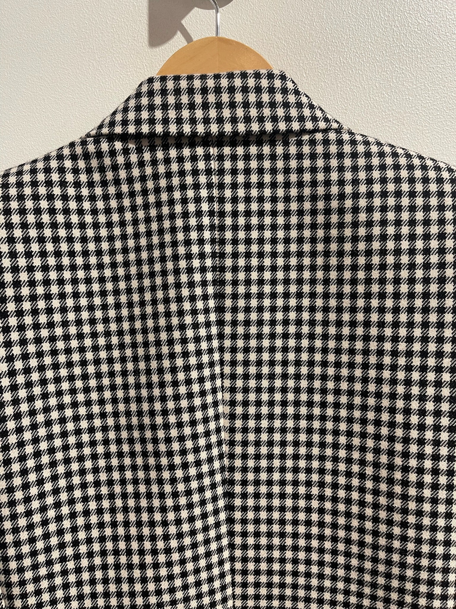 Blazer en laine à motif vichy noir et blanc avec épaulettes, fermeture boutonnée et poches latérales.
