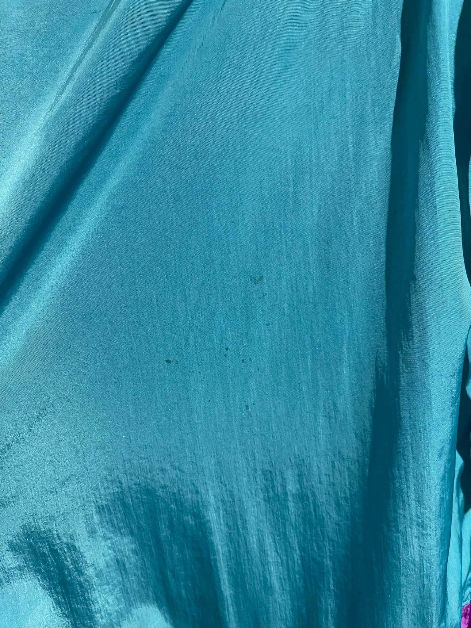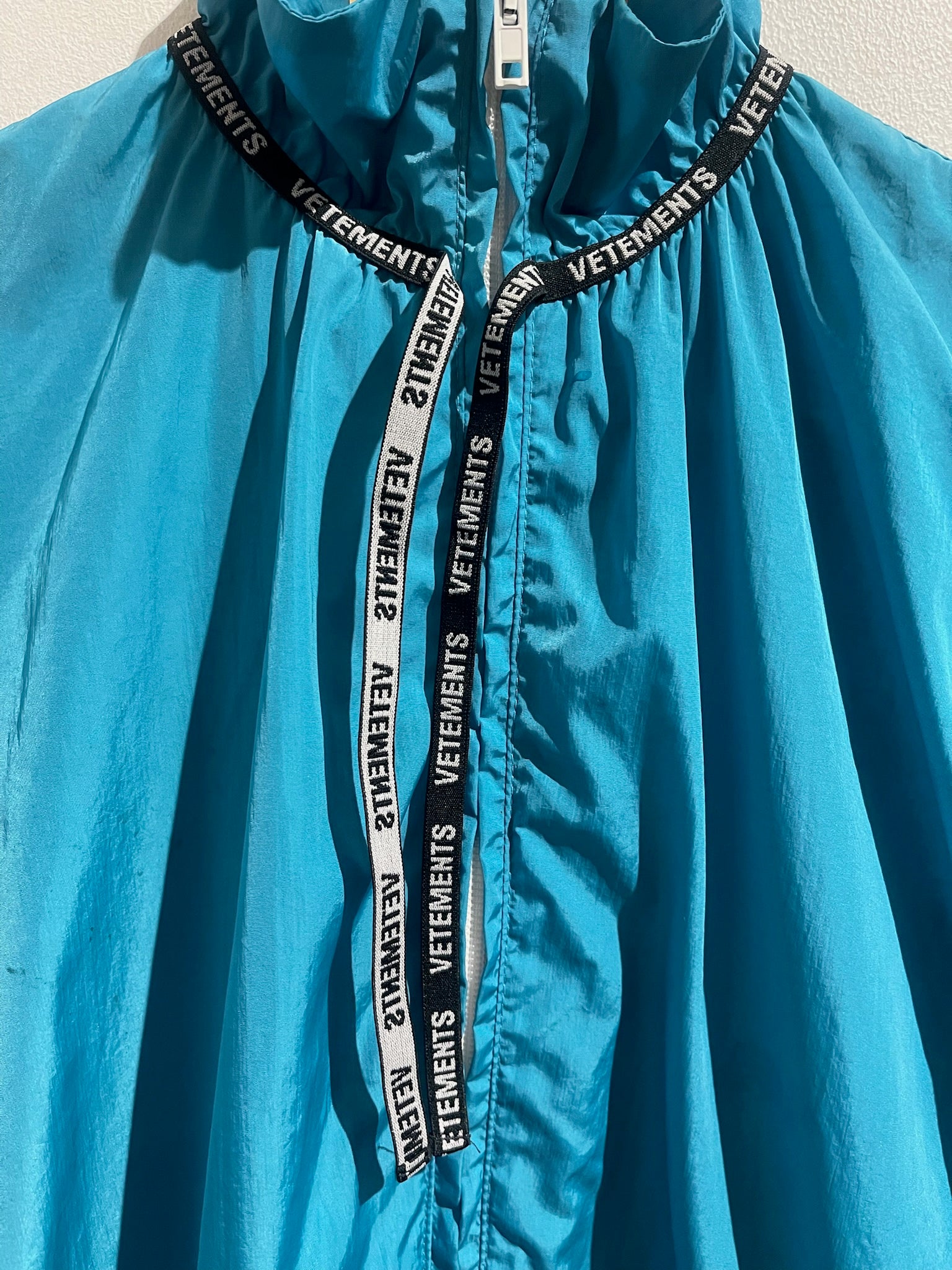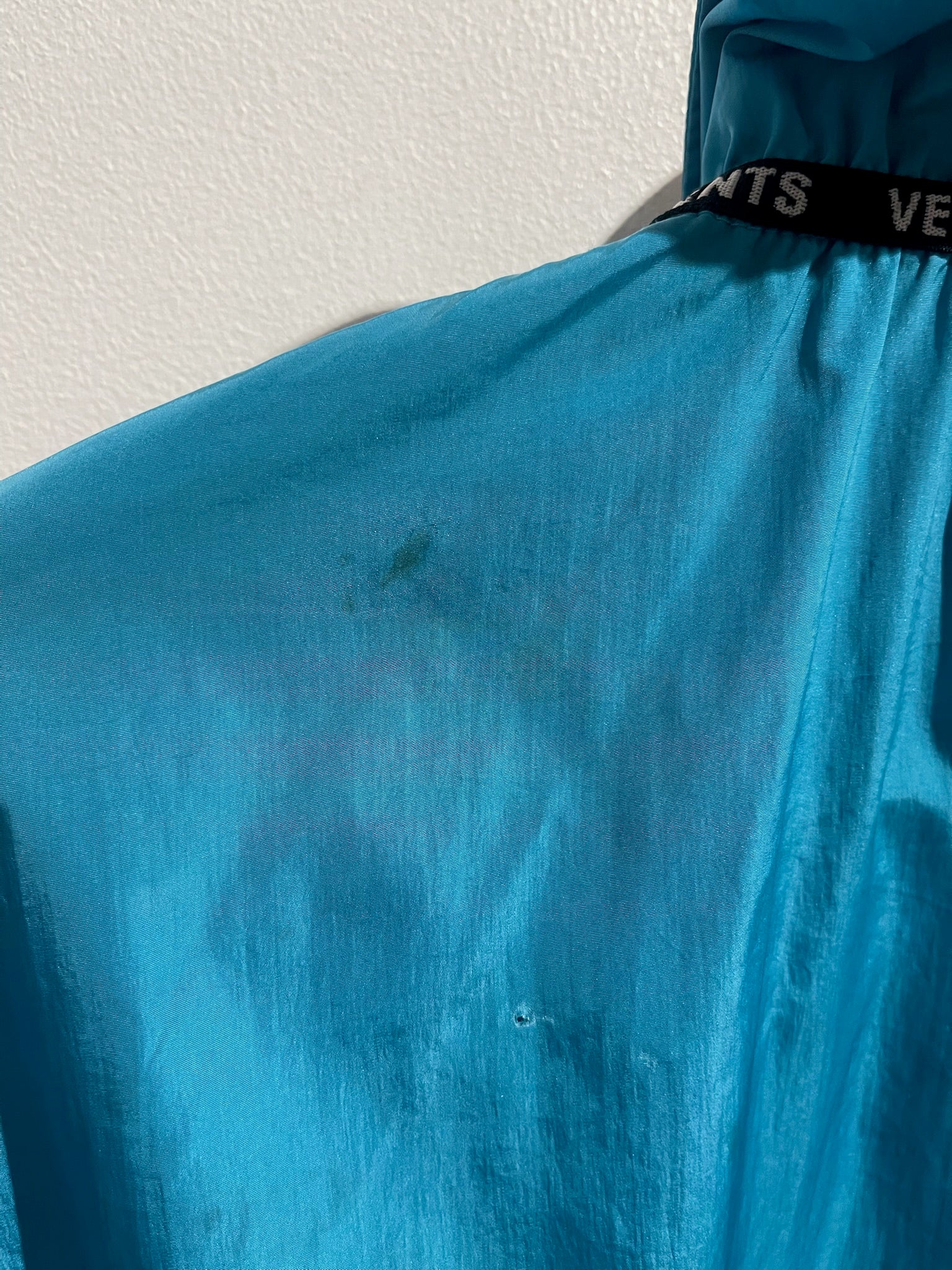 Veste imperméable en polyamide bleu, violet, blanc et noir avec fermeture zippée et poches latérales. Col montant et poignets ornés du logo Vetements. Ourlets bruts. Coupe oversize et modèle unisexe.